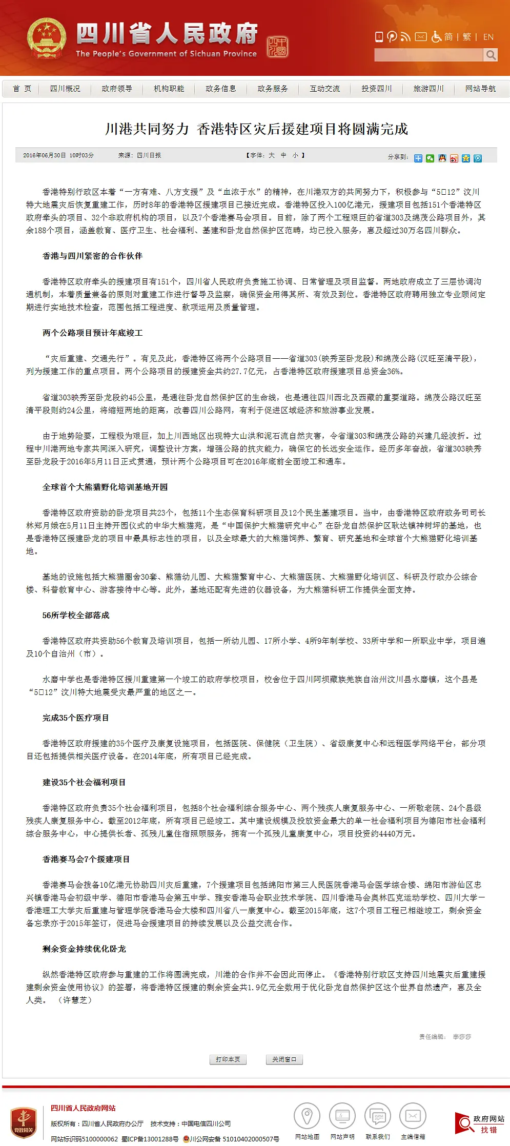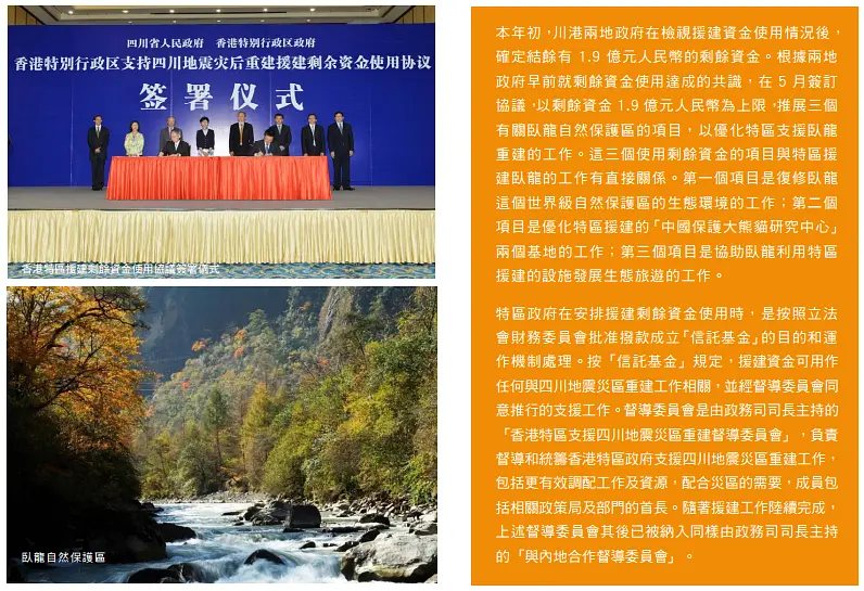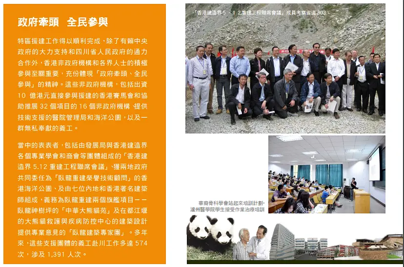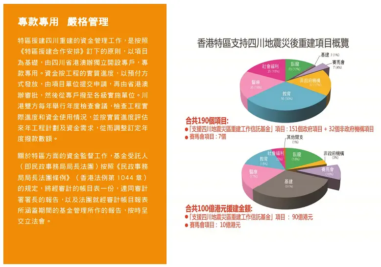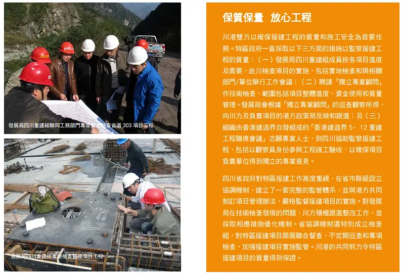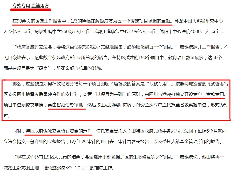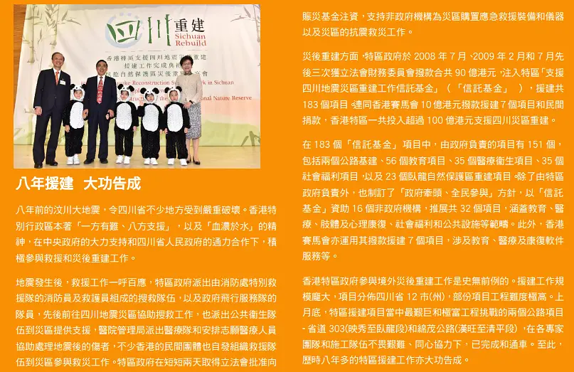 博文里有一个关键点,说hk gov有发布一个《援建工作完成报告》文件,那么到底有没有这个文件呢?先度娘搜关键词“hk 援建工作完成报告”,相关链接有很多哦,人民网、凤凰网、环球时报、网易、渣浪都有报道,当然您也可以说现在的媒体不可信。那么我找到了两份官方的总结,一份是四川gov的报告,罗列了hk援建的项目,并且交代了剩余资金的去向,链接如下: