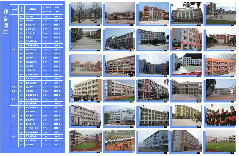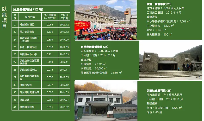 里面有详细罗列hk援建的各个项目,包括规模、资金、工期、项目难度,还有施工前后对比照。一共有93页,真的很详尽,我这里就贴一部分。